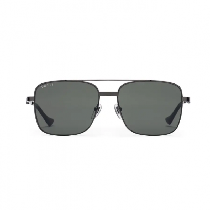 Gucci 2023早秋系列太阳眼镜采用现代款型和标识细节,焕新演绎经典款式。这款眼镜采用方形镜框,以钌色调深灰色金属材质精制而成,洋溢复古风情。与之相配的镜腿饰有Gucci刻花图案,精美的织带配色珐琅和深玳瑁色醋纤镜脚更添时尚质感。