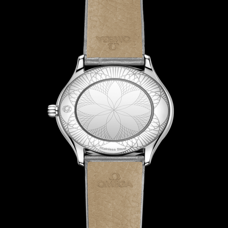 別紅色歐米茄標識,鍍銠零件及螺旋式打磨處理。