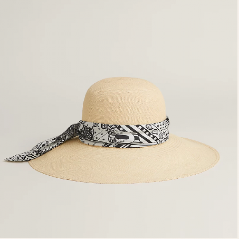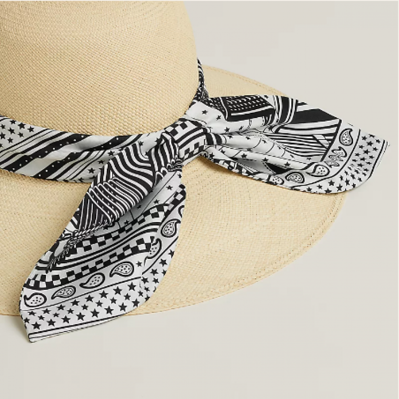 巴拿馬布雷紗女士帽子,斜紋真絲帽帶飾有維吉妮·雅蒙(Virginie Jamin)設計的「曲折鞍帶頭巾」圖案印花。