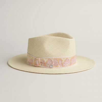 巴拿馬布雷紗女士帽子,蝴蝶結帽帶飾有提花「Coquillages」圖案。