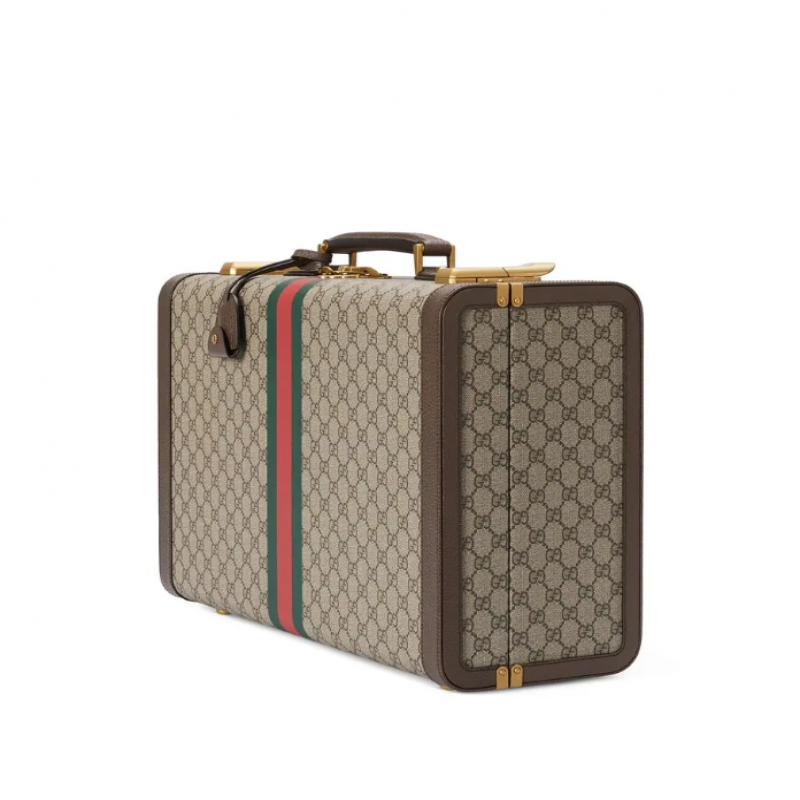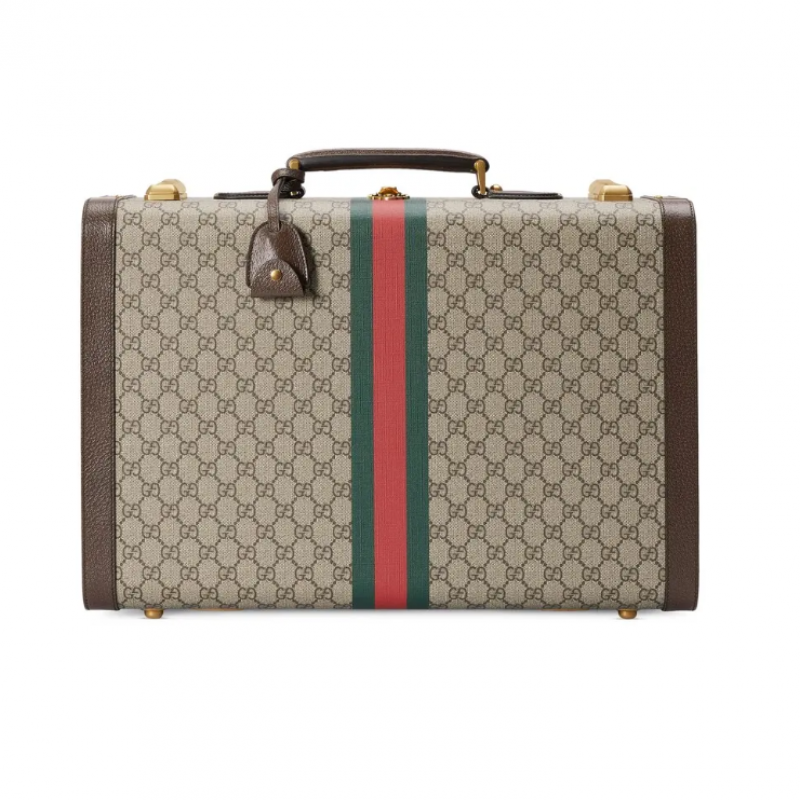 这款行李箱采用饰GG字母交织图案的GG Supreme帆布和织带细节,彰显复古格调。两大典藏元素搭配棕色皮革细节,令经典图案焕发出新的魅力。
