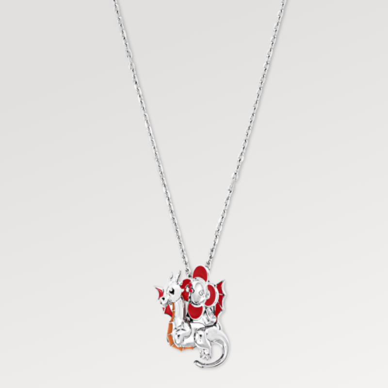 LV Dragon項鍊匠心雕琢Vivienne乘駕祥龍的吊墜設計,以鉸接羽翼塑造振翅高飛之姿,與LV字母裝潢共同連於可調節鏈條,可為摯愛著裝注入盎然意趣,成就品牌擁躉的新春佳禮。